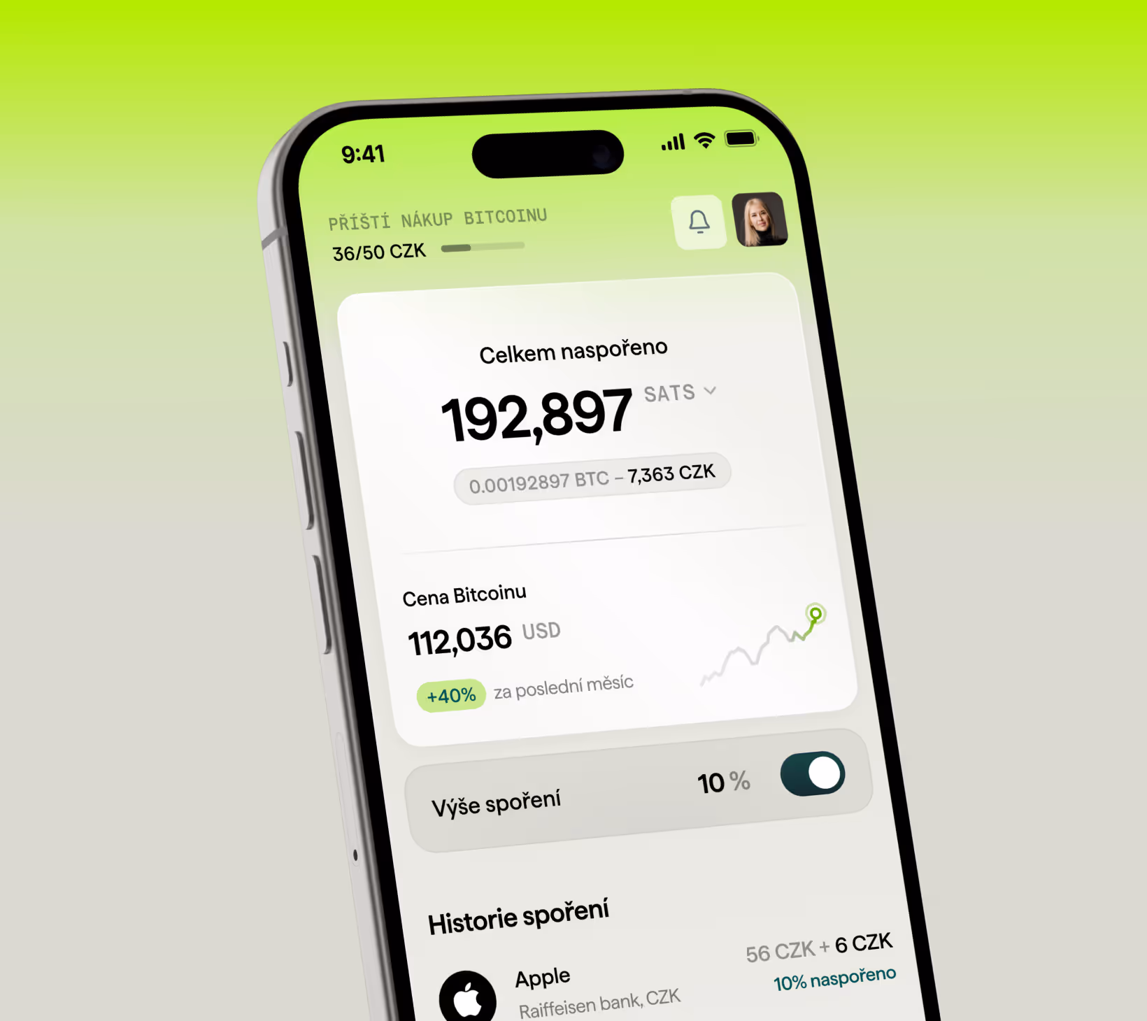 Propojte svou platební kartu s aplikací. Při každém nákupu – káva, oběd, potraviny – se vám malá částka automaticky uloží do Bitcoinu.