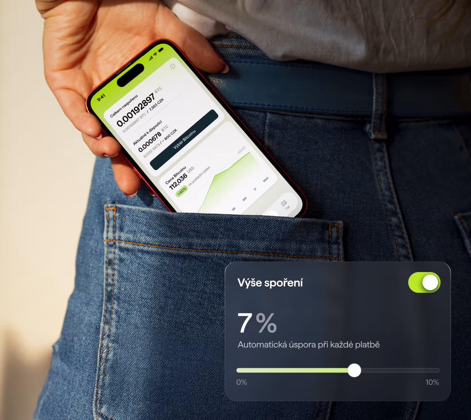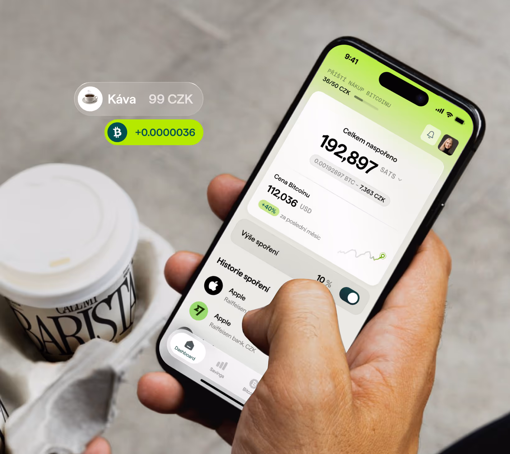 Propojte svou platební kartu s aplikací. Při každém nákupu – káva, oběd, potraviny – se vám malá částka automaticky uloží do Bitcoinu.