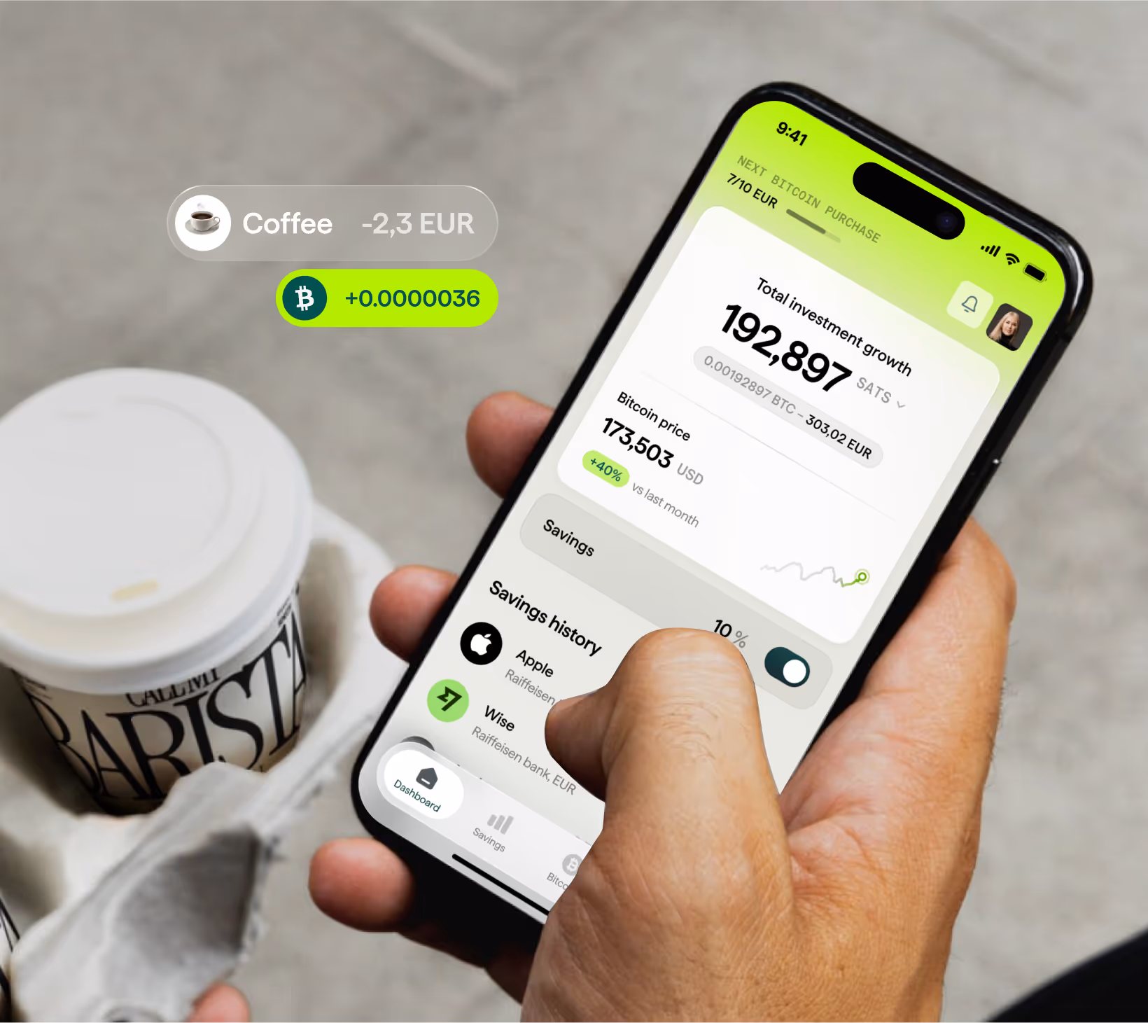 Connect your payment card with the app. With every purchase – coffee, lunch, groceries – a small amount is automatically saved in Bitcoin.