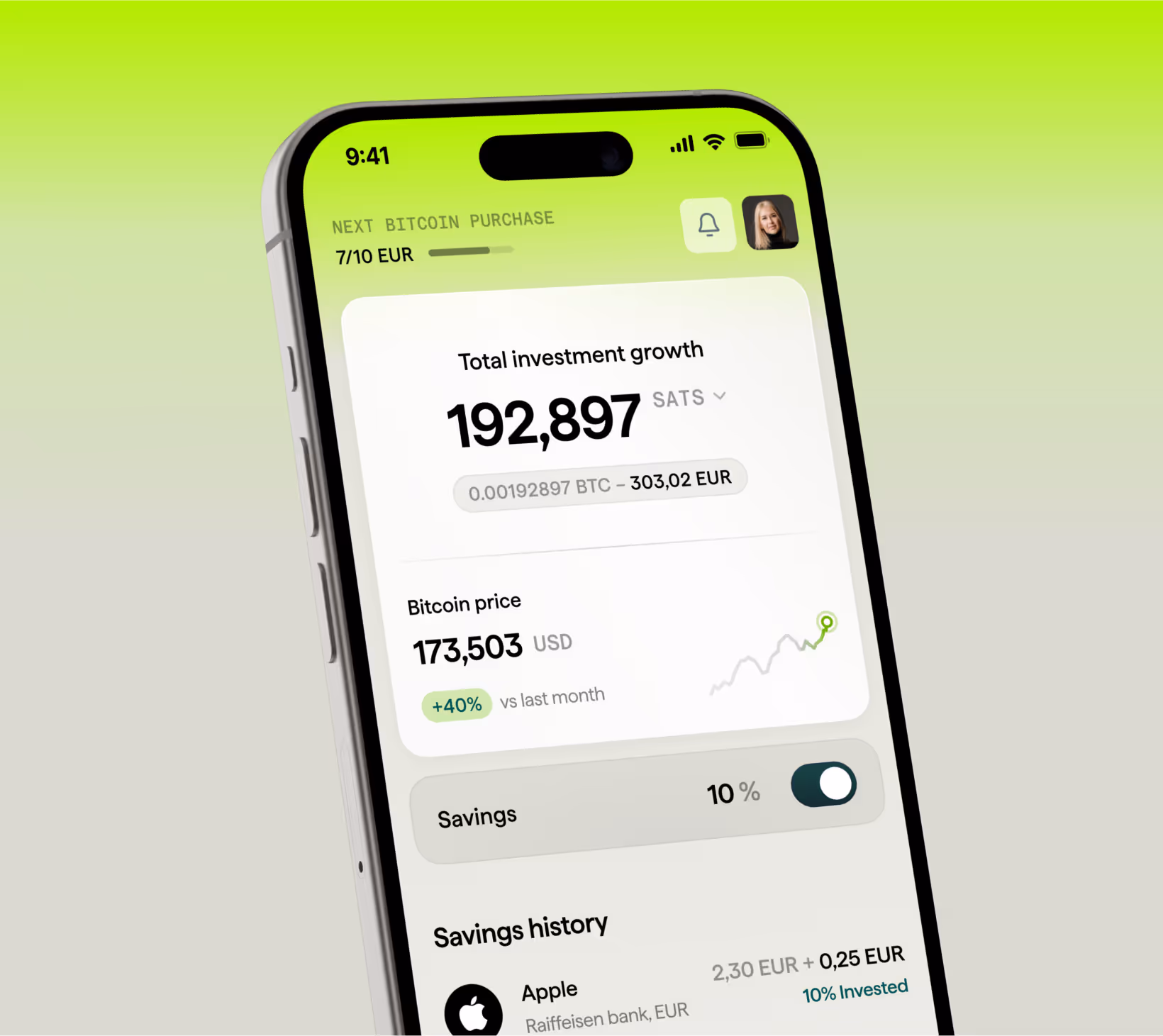 Pay as usual, and the app takes care of the rest. No need to track Bitcoin or analyse charts – your savings run automatically.